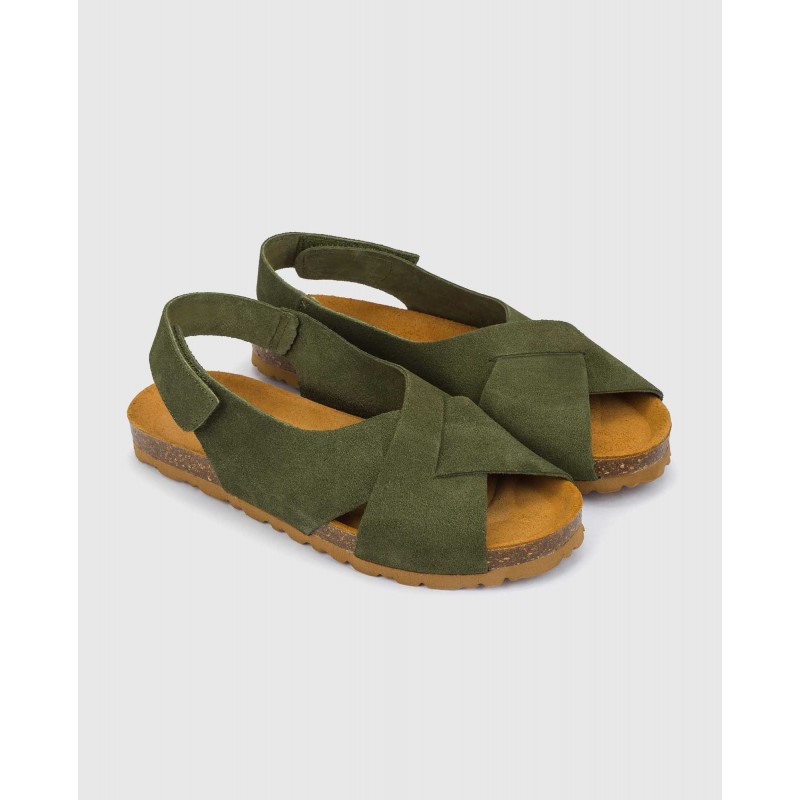 Sandalia plana de color verde con una altura de 2 cm. Diseño formado por dos suaves tiras entrecruzas entre sí y un cómodo cierre de velcro. Versatilidad y comodidad en un mismo modelo. Corte de piel vacuna. Plantilla acolchada y antideslizante que añade un extra de comodidad. Elaborada mediante un proceso de fabricación artesanal que usa tintes vegetales y embalajes sostenibles para respetar el medio ambiente. Fabricada en España.