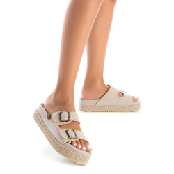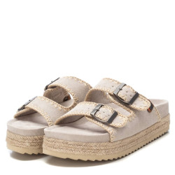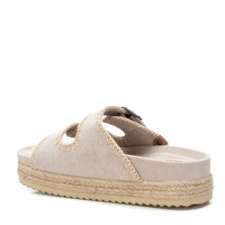 Sandalia de mujer, de la marca Refresh. Fabricada en suave antelina. Modelo de doble pala con hebillas ajustables. Planta bios forrada con el mismo material que el corte. Piso forrado en yute trenzado y suela antideslizante. Este modelo ha obtenido el certificado vegano por la organización mundial PETA (Organización de los derechos de los animales).