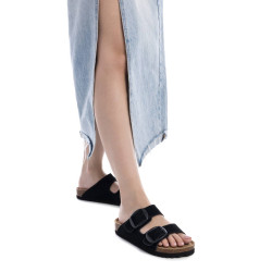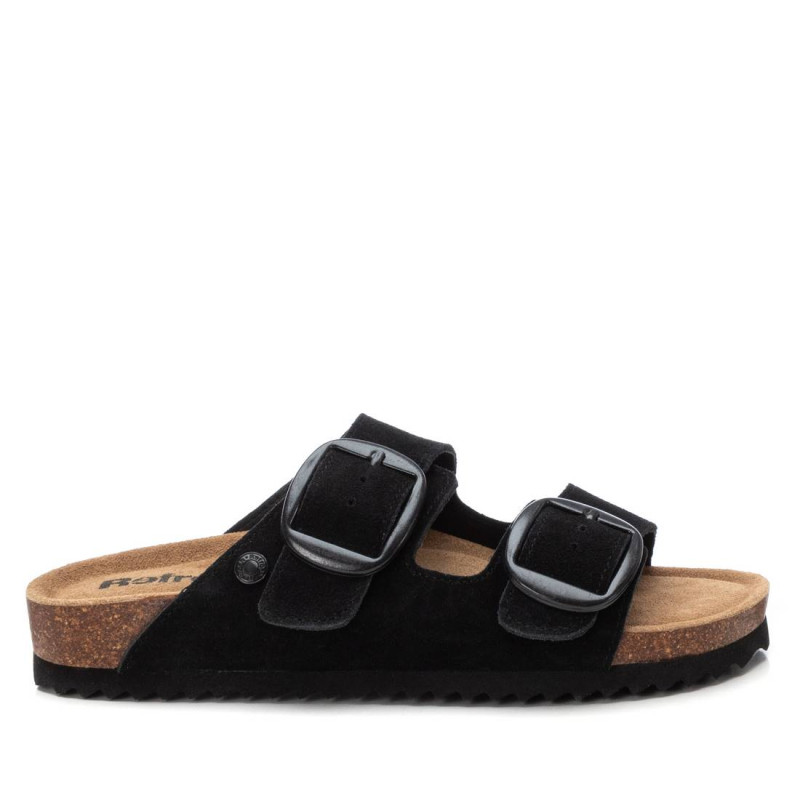 Sandalia de mujer, de la marca Refresh. Fabricada en serraje. Pala ancha de doble tira con hebilla para ajustar al pie. Cómoda planta tipo bios. Suena de goma canalada antideslizante.