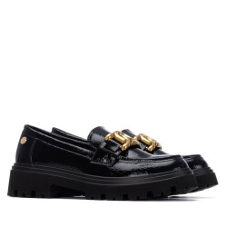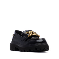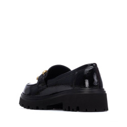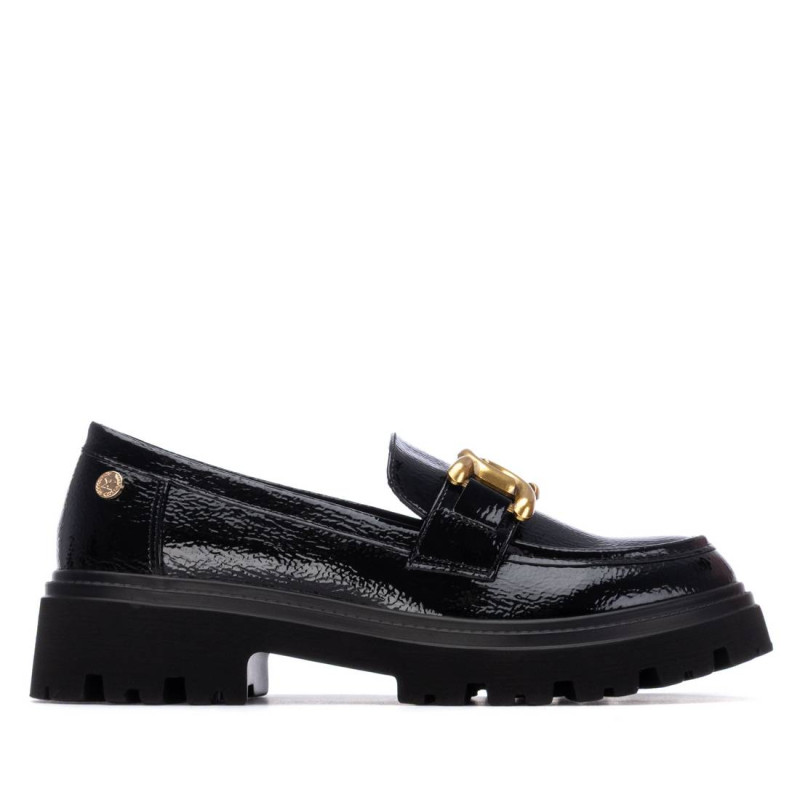 mocasin de mujer, de la marca Xti Basic. Fabricado en charol, con un acabado brillante y elegante. Cuenta con una suela plana antideslizante con tacón bajo de 5 cm, que proporciona comodidad, estabilidad y tracción en todo tipo de superficies. El detalle dorado en el empeine añade un toque sofisticado y moderno al diseño. Un mocasin ideal para un look casual y chic, con la seguridad de una suela antideslizante para tu comodidad. Este modelo ha obtenido el certificado vegano por la organización mundial PETA (Organización de los derechos de los animales).