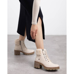 Botín de mujer, de la marca Refresh. Fabricado en material que imita a la piel. Collarín de pelo para los días más fríos. Cierre mediante cremallera interior. Cordones regulables al tono. Cremallera lateral decorativa. Tacón en bloque de 6 cm. Suela de goma antideslizante. Plantilla extraíble. Este modelo ha obtenido el certificado vegano por la organización mundial PETA (Organización de los derechos de los animales).