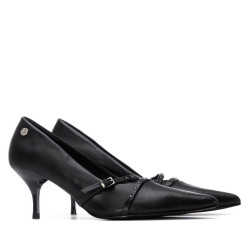 Zapato de mujer, de la marca Xti. Fabricado en material que imita la piel, con un elegante tacón de aguja que le da un toque sofisticado y estilizado. El diseño cuenta con dos tiras en el empeine, una decorada con tachas y la otra con una pequeña hebilla decorativa, aportando un detalle moderno y único. Este zapato es perfecto para quienes buscan combinar comodidad y elegancia en sus looks. Ideal para ocasiones especiales o para elevar cualquier atuendo, garantizando confort y distinción en cada paso. Este modelo ha obtenido el certificado vegano por la organización mundial PETA (Organización de los derechos de los animales).