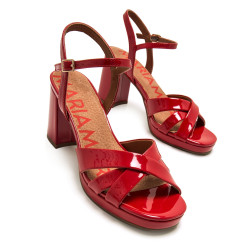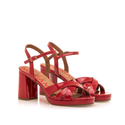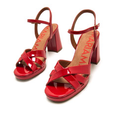 Sandalias rojas de tacón para mujer, modelo Cefalu de Mariamare. Este modelo presenta un diseño con tiras cruzadas en la parte delantera que aportan un toque moderno y femenino, mientras que la pulsera ajustable al tobillo asegura un ajuste seguro. El tacón ancho y la plataforma delantera proporcionan estabilidad y estilo, ideal para largas jornadas o eventos especiales. Su acabado brillante resalta en cualquier conjunto.