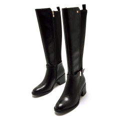 Botas altas de color negro para mujer de Mariamare, modelo Onore. La caña alta estiliza la figura, mientras que la combinación de texturas en el talón y la hebilla dorada lateral añaden un toque distintivo. Su tacón ancho brinda estabilidad y comodidad, perfectas para llevar con faldas, vestidos o pantalones ajustados en los días más fríos.
