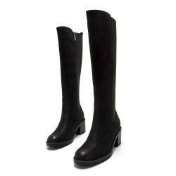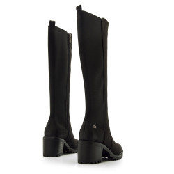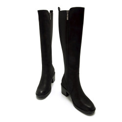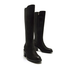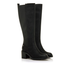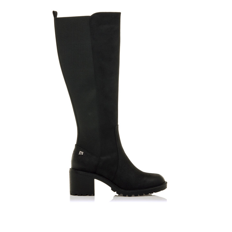 Bota de tacón de color negro para mujer de MTNG modelo Maya. Este diseño de caña alta combina un estilo clásico con una suela dentada y tacón ancho que proporciona estabilidad y altura. El lateral elástico aporta flexibilidad y un ajuste cómodo a la pierna, mientras que su acabado liso la convierte en una opción versátil para looks de invierno. Fabricado con un 60% de algodón reciclado post consumo y un 40% de algodón convencional. Con certificado VEGANO sellado por INESCOP, el cual garantiza que la naturaleza química principal del material no se corresponde con fibras de origen animal.