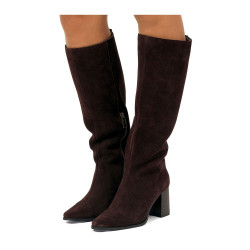 Botas de tacón para mujer marca Mtng, modelo Meghan de color moka. Su diseño liso y alargado estiliza la pierna, mientras que la puntera afilada y el tacón ancho alto aportan una silueta moderna y femenina. Perfecta para combinar con vestidos o faldas midi, su acabado en serraje suave añade un toque cálido y versátil para los meses más fríos. Fabricado con piel que proviene de fabricantes aprobados por el protocolo «Leather Working Group», donde evalúan el cumplimiento ambiental y el desempeño, promoviendo prácticas comerciales ambientales sostenibles dentro de la industria del cuero.