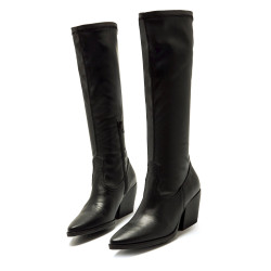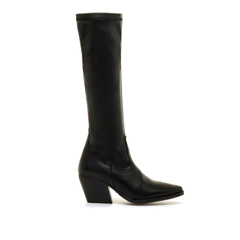 Bota alta stretch de color negro para mujer de Mtng, modelo Missouri de estilo cowboy. Destaca por su caña ajustada tipo calcetín que se adapta al contorno de la pierna y por su punta afilada con acabado angular, ideal para dar un toque moderno a cualquier conjunto. El tacón ancho medio aporta estabilidad sin renunciar al estilo, mientras que la cremallera lateral interior facilita el calce. Perfectas para combinar con vestidos, faldas o pantalones pitillo en los meses más fríos. Fabricada con piel que proviene de fabricantes aprobados por el protocolo «Leather Working Group», donde evalúan el cumplimiento ambiental y el desempeño, promoviendo prácticas comerciales ambientales sostenibles dentro de la industria del cuero.