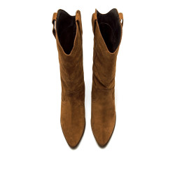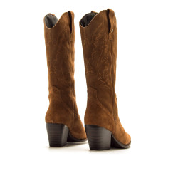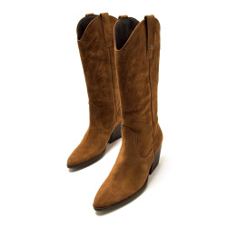 Bota de estilo cowboy para mujer, modelo Missouri de serraje de color roble de Mtng. Este modelo destaca por su diseño de caña alta con bordados decorativos de inspiración western y acabado de piel, ideal para aportar un toque distintivo a cualquier look. El tacón ancho inclinado proporciona estabilidad y comodidad, mientras que la puntera afilada resalta su estética clásica. Un modelo versátil para combinar con diferentes looks.