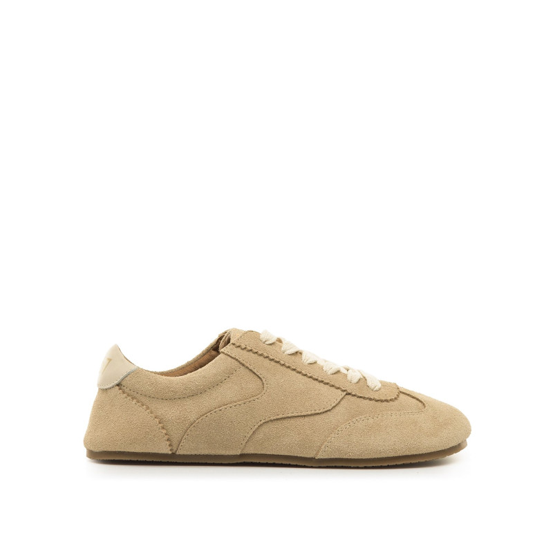 Zapatillas de piel de color camel para mujer, modelo Free Mia de la marca Mtng. Este diseño casual de serraje destaca por sus líneas onduladas y pespuntes decorativos sobre una base afelpada que aporta suavidad y textura. Con cierre de cordones de color blanco roto. Diseñadas y desarrolladas especialmente en colaboración con el Dr. Juanjo López, traumatólogo deportivo, para respetar el desarrollo natural del pie. Se trata de un calzado minimalista que gracias a su puntera ancha, suela totalmente plana (cero drop) y flexibilidad, mejora la anatomía del pie y favorece una mejor posición del mismo. Fabricadas con piel que proviene de fabricantes aprobados por el protocolo «Leather Working Group», donde evalúan el cumplimiento ambiental y el desempeño, promoviendo prácticas comerciales ambientales sostenibles dentro de la industria del cuero.