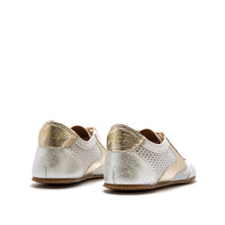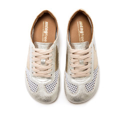 Zapatillas barefoot de color plata para mujer de la marca Mtng, modelo Free Mia, de estilo urbano con un toque llamativo. Este modelo de piel con acabado metalizado y detalles brillantes dorados, incorpora paneles laterales de malla tipo rejilla en blanco que aportan textura y contraste. Diseñadas y desarrolladas especialmente en colaboración con el Dr. Juanjo López, traumatólogo deportivo, para respetar el desarrollo natural del pie. Se trata de un calzado minimalista que gracias a su puntera ancha, suela totalmente plana (cero drop) y flexibilidad, mejora la anatomía del pie y favorece una mejor posición del mismo. Al estar fabricadas con piel natural, la plantilla puede presentar un aspecto arrugado o irregular en algunas zonas, algo completamente normal que no afecta al uso y que refleja la autenticidad y singularidad del material.