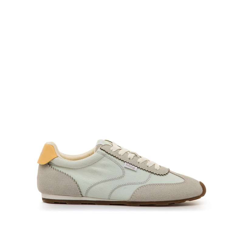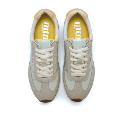 Zapatillas para mujer de la marca Mtng, modelo Janet de color verde claro y gris, de estilo retro. Su diseño combina paneles de distintas texturas y un distintivo detalle amarillo en el talón que le da un aire vintage. Con cierre de cordones y suela dentada marrón. Incluye plantillas con tecnología Starfit, que mejoran la comodidad en cada paso. Con certificado VEGANO sellado por INESCOP, el cual garantiza que la naturaleza química principal del material no se corresponde con fibras de origen animal.