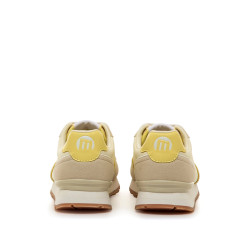 Zapatillas amarillas con detalles en beige y blanco para mujer, modelo Joggo Classicde Mtng. Este diseño combina una base clara con contrastes suaves que aportan un toque luminoso y actual, ideal para looks urbanos relajados. La silueta retro y el logo lateral en relieve le dan un aire vintage, mientras que la suela con relieve y las plantillas con tecnología Starfit, mejoran la comodidad en cada paso. Con certificado VEGANO sellado por INESCOP, el cual garantiza que la naturaleza química principal del material no se corresponde con fibras de origen animal.