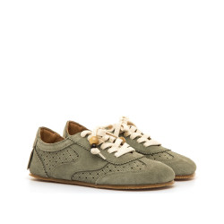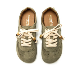 Zapatos barefoot de piel de color verde para mujer de la marca Mtng, modelo Free Mia de estilo casual y diseño perforado. Incorpora cordones beige con detalle de cuentas decorativas y un acabado de serraje que le da un aspecto natural. La parte trasera incluye flecos que aportan un toque diferencial al diseño. Diseñadas y desarrolladas especialmente en colaboración con el Dr. Juanjo López, traumatólogo deportivo, para respetar el desarrollo natural del pie. Se trata de un calzado minimalista que gracias a su puntera ancha, suela totalmente plana (cero drop) y flexibilidad, mejora la anatomía del pie y favorece una mejor posición del mismo. Al estar fabricadas con piel natural, que proviene de fabricantes aprobados por el protocolo «Leather Working Group», la plantilla puede presentar un aspecto arrugado o irregular en algunas zonas, algo completamente normal que no afecta al uso y que refleja la autenticidad y singularidad del material.