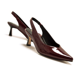 Zapato de tacón destalonado de color burdeos para mujer de MTNG, modelo Ninette de estilo clásico. Este diseño combina un tacón medio fino con acabado de charol brillante, ideal para dar un toque formal sin renunciar a la comodidad. Su estructura abierta en el talón con tira elástica proporciona un ajuste flexible y favorecedor. El diseño estilizado y la puntera afilada lo convierten en una opción versátil para looks de oficina o eventos especiales.