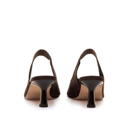 Zapatos de tacón tipo slingback de color marrón para mujer de la marca Mtng, modelo Ninette, con diseño destalonado y acabado brillante que añade un toque actual. La silueta afilada y el tacón medio fino con base cuadrada estilizan sin perder comodidad, mientras que la tira trasera elástica favorece el ajuste. Este modelo es una opción funcional y versátil para looks de oficina o combinaciones más informales.