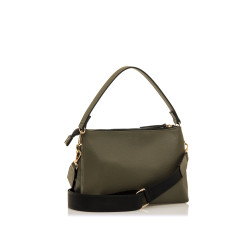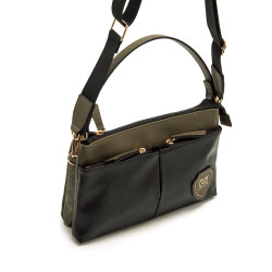 Bolso tipo saddle bag para mujer de Mariamare modelo Nila, con diseño bicolor que combina cuerpo en tono verde kaki con bolsillos frontales negros de textura marcada. Cuenta con asa corta y correa ajustable para adaptarse a diferentes estilos de uso. Sus dos bolsillos delanteros con cremallera permiten organizar objetos pequeños de forma accesible, mientras que el compartimento principal ofrece espacio suficiente para el día a día. El escudo decorativo con el logo completa un look funcional con aire urbano.