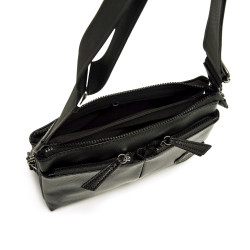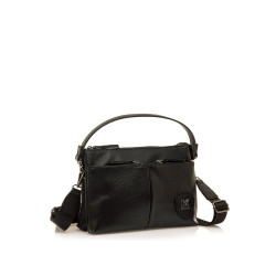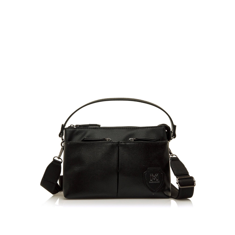 Bolso bandolera de color negro para mujea, modelo Nila de Mariamare. Este diseño combina funcionalidad y estilo gracias a sus múltiples bolsillos frontales con acabado brillante y cierre de cremallera. Cuenta con asa superior, que permite llevarlo al hombro, y correa ajustable para usarlo cruzado. Con acabado texturizado, ofrece un formato compacto pero con buena capacidad para llevar lo esencial siempre a mano. El detalle del logotipo en relieve le da un toque distintivo sin sobrecargar el diseño.