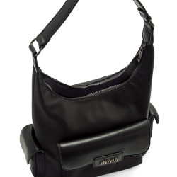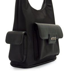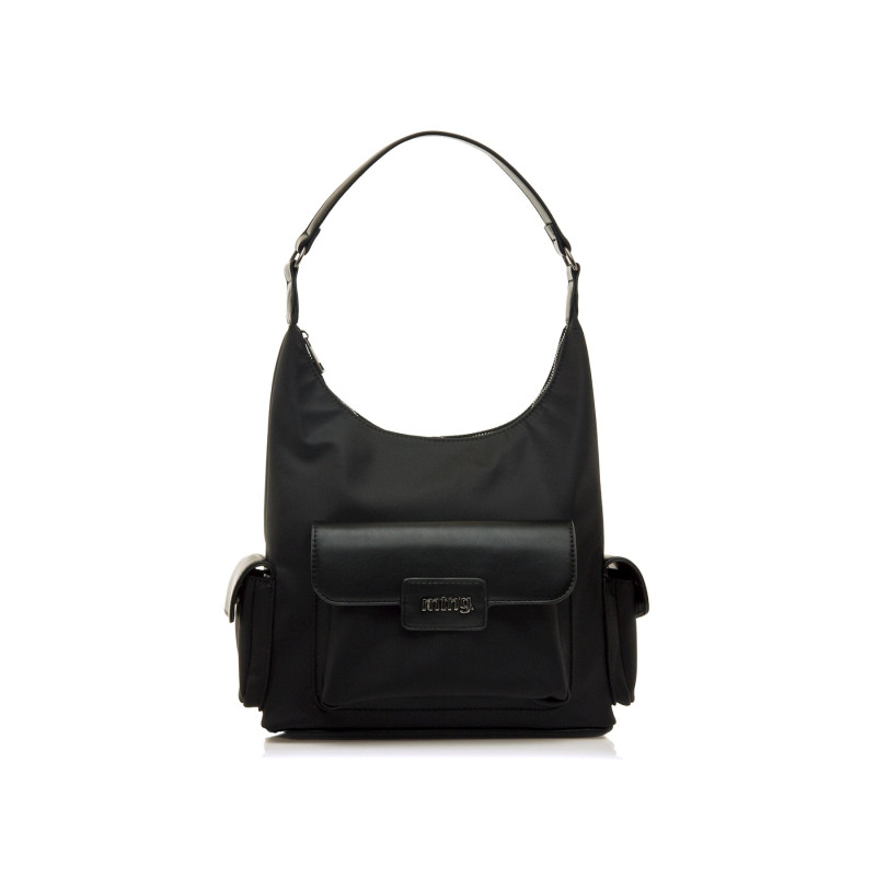 Bolso hobo de color negro para mujer de la marca Mtng, modelo Patsy. Presenta una silueta alargada con asa ancha corta y dos compartimentos laterales con solapa, incluyendo un bolsillo frontal con logo mtng en relieve. El cierre principal es de cremallera y su diseño estructurado permite llevar lo esencial de forma ordenada. Ideal para el día a día, este modelo ofrece comodidad y un look actual con un toque minimalista.