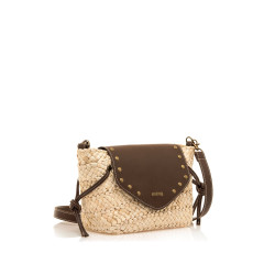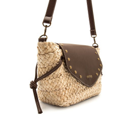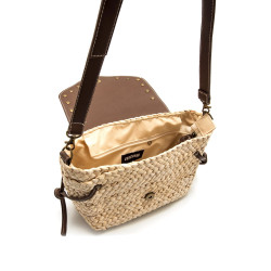 Bolso bandolera de color natural para mujer de la marca Mtng, modelo Peces de estilo artesanal. Su diseño combina un cuerpo trenzado de maíz con una solapa marrón moka decorada con tachuelas metálicas doradas, creando un contraste rústico y moderno. La correa ajustable y los detalles de nudos laterales aportan un toque casual y funcional, mientras que el cierre con broche magnético y la cremallera aseguran el contenido. Ideal para llevar lo esencial en tus planes de verano o escapadas de fin de semana.