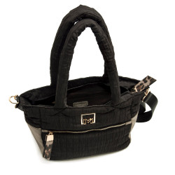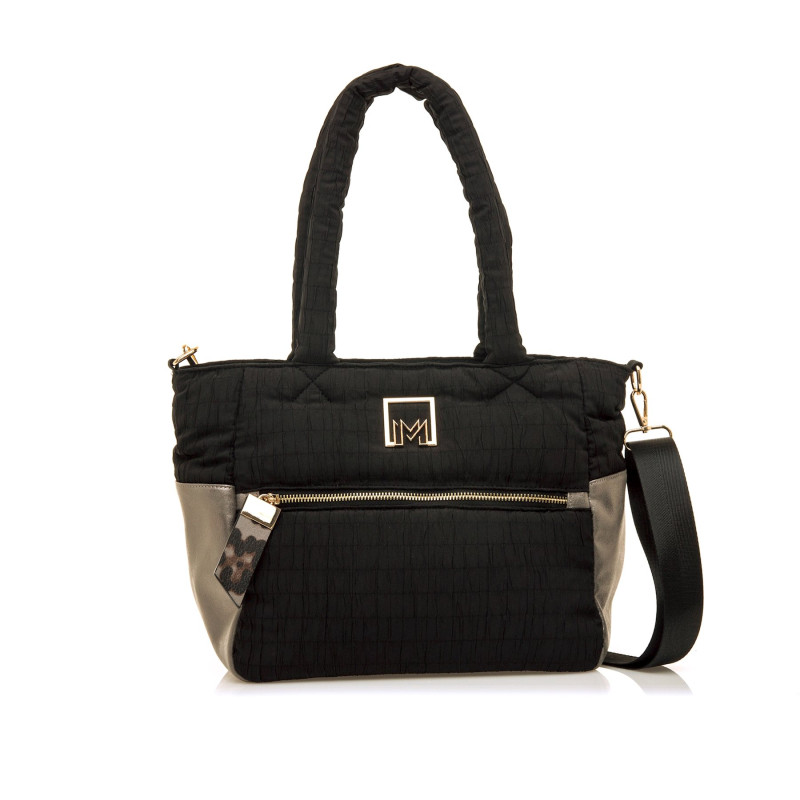 Bolso shopper negro para mujer de Mariamare, modelo Pepi. Su diseño acolchado con asas largas y detalles en contraste de color plomo metalizado le dan un aire moderno y versátil. Incorpora un bolsillo frontal con cremallera y logo metálico que aporta un toque distintivo. La correa bandolera ajustable permite llevarlo también al hombro, adaptándose a diferentes estilos y momentos del día.