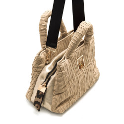 Bolso tipo tote de mujer, modelo Pila de Mariamare de color arena. Presenta un diseño acolchado con textura arrugada, asas superiores forradas a juego y correa negra ajustable para mayor versatilidad. Su forma estructurada y el logo metálico en el frontal aportan un toque distintivo que lo convierte en una opción práctica y moderna para el uso diario. Ideal para llevar lo esencial con comodidad y estilo.