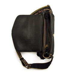 Bolso bandolera negro de mujer, modelo Sac de la marca MTNG. Diseñado con una solapa que se cierra mediante correa central y hebilla decorativa dorada con acabado de botón imantado. Este modelo destaca por sus detalles de textura en los laterales y flecos en el lateral. La bandolera ancha con bordado floral en tonos rosados y dorados aporta un contraste llamativo y chic. Incluye compartimentos interiores con cierre de cremallera para mantener tus objetos bien organizados.