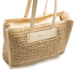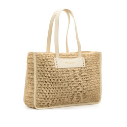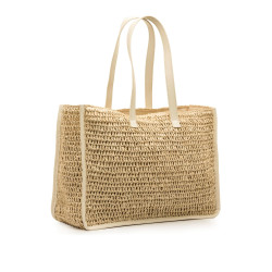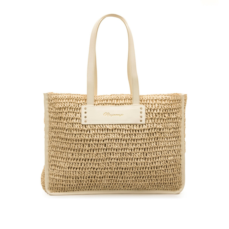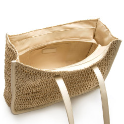 Bolso shopper de color vainilla para mujer de la marca Mariamare, modelo Salla diseñado con un acabado trenzado de rafia que aporta un aire fresco y veraniego. Su formato amplio permite llevar todo lo necesario de forma cómoda, mientras que las asas largas de color beige facilitan el transporte al hombro. Incorpora detalles brillantes sobre la claca frontal beige que realzan el diseño, y un interior forrado con cierre de cremallera y bolsillo auxiliar para mantener el contenido más organizado. Una opción versátil para combinar con looks relajados.