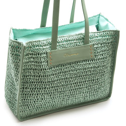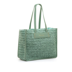 Bolso shopper de color verde turquesa para mujer de la marca Mariamare, modelo Salla, diseñado con un acabado trenzado de rafia que aporta un aire veraniego y natural. Su formato amplio y estructurado resulta práctico para llevar todo lo necesario con comodidad. Incluye asas largas a juego que facilitan llevarlo al hombro, cierre principal de cremallera, y un interior forrado con bolsillo interior para una mejor organización. El detalle del logo frontal con tachas doradas añade un toque distintivo, convirtiéndolo en un complemento fácil de combinar.