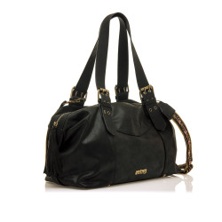 Bolso bowling negro de mujer, modelo Sanny de mtng. Sus asas con hebillas doradas y correa bandolera bordada con motivos florales, convierten este diseño en funcional y estiloso a partes iguales. Su silueta redondeada incluye detalles de textura en los laterales y flecos decorativos, aportando un aire desenfadado. Un bolso amplio y cómodo con un toque distintivo.