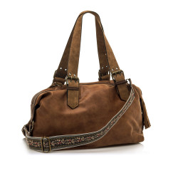Bolso de color cuero para mujer de mtng, modelo Sanny de estilo boho casual. Este diseño tipo bowling incorpora doble asa reforzada con hebillas metálicas y una correa regulable con estampado floral que permite llevarlo al hombro o cruzado. El cuerpo del bolso tiene un acabado envejecido que le da un aire desenfadado y versátil. Su interior espacioso con cierre de cremallera lo convierte en una opción práctica para diario o escapadas sin renunciar al estilo.