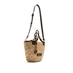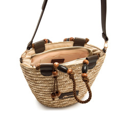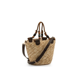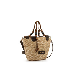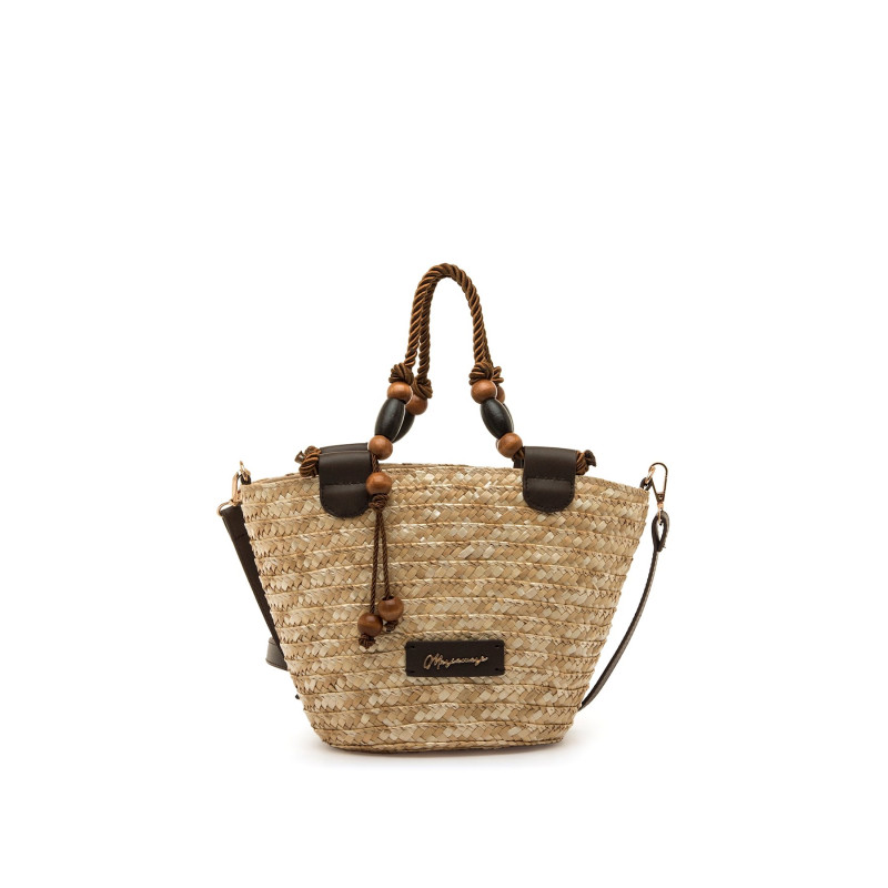 Bolso tipo capazo de paja de color natural para mujer, modelo Saro de Mariamare, diseñado para aportar un aire fresco y funcional a los looks de temporada. Su estructura trenzada se combina con asas cortas de cuerda con cuentas decorativas que añaden un detalle distintivo, además de una bandolera moka ajustable para mayor versatilidad. El formato compacto permite llevar lo imprescindible de forma cómoda, mientras que el interior forrado con cierre de cremallera facilita la organización. Incluye placa frontal con el logo de la marca que refuerza su identidad.