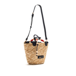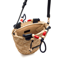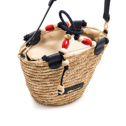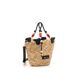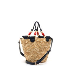 Bolso tipo capazo de color natural de la marca Mariamare, modelo Saro, con diseño trenzado de paja. Su estructura cónica incorpora doble asa, una de cuerda gruesa azul marino decorada con cuentas de madera en tonos crudo y rojo, y otra bandolera ajustable en polipiel azul para mayor comodidad. El interior está forrado y cuenta con cierre de cremallera, además de bolsillo organizador. Un bolso funcional y con personalidad, perfecto para completar looks frescos y desenfadados en época estival.