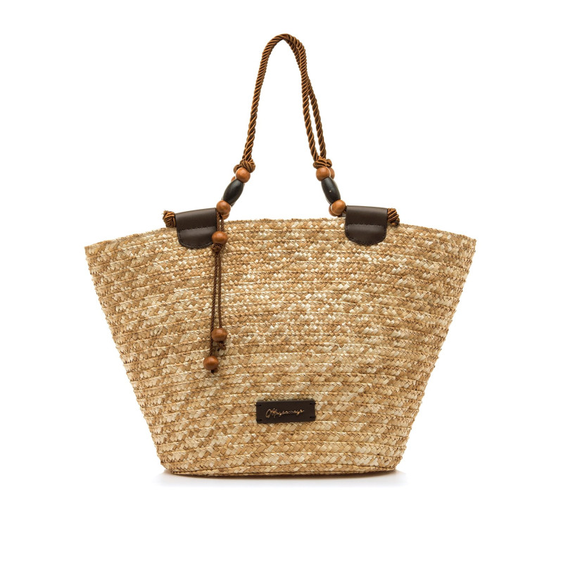 Bolso capazo de color natural para mujer de Mariamare, modelo Savana, ideal para acompañar planes de temporada con un diseño práctico y actual. Su cuerpo trenzado de paja destaca por las asas de cuerda con cuentas decorativas que aportan un detalle llamativo y diferente. El formato amplio permite llevar todo lo necesario con comodidad, mientras que el interior forrado con bolsillo con cremallera facilita una mejor organización. Incorpora detalle frontal con logo de la marca que completa su estética.