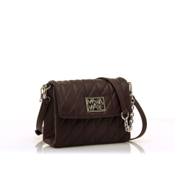 Bolso de color burdeos para mujer, modelo Sele de Mariamare estilo bandolera. Este diseño acolchado con patrón diagonal y cierre de solapa combina funcionalidad con un toque actual. Incluye una correa con detalle de cadena metálica plateada que permite llevarlo al hombro o cruzado. El logo frontal en acabado brillante aporta un contraste moderno que completa el diseño, ideal para llevar lo imprescindible con estilo.