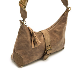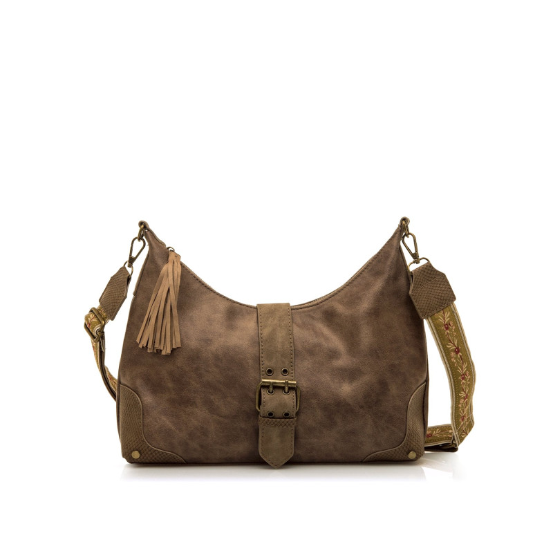 Bolso de color taupe texturizado para mujer de mtng, modelo Soco de estilo boho casual. Presenta un diseño con cuerpo suave y forma tipo hobo, acompañado de una correa ancha ajustable con bordado floral que añade un toque distintivo. Incorpora detalles decorativos como borlas laterales de flecos y tira central con hebilla decorativa y cierre de botón magnético. Su interior con cierre de cremallera permite mantener tus pertenencias seguras, convirtiéndolo en una opción cómoda y práctica para el día a día.