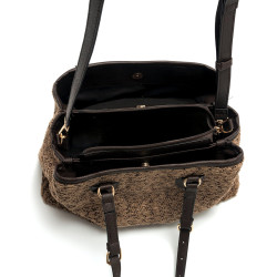 Bolso tote de color taupe con detalles en moka para mujer de Mariamare modelo Tayla. Su diseño destaca por su textura efecto boucle que aporta calidez y estilo. Incorpora dos asas de hombro ajustables y una correa extraíble para poder llevarlo tipo bandolera. Su diseño amplio con cierre superior de cremallera lo convierte en una opción práctica para el día a día. El detalle del logo dorado sobre base moka en la parte frontal añade un contraste visual atractivo.