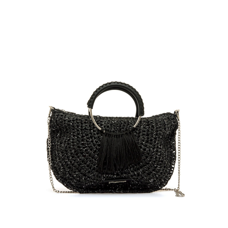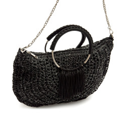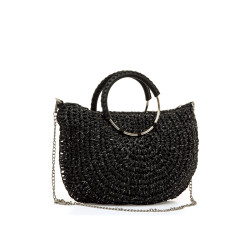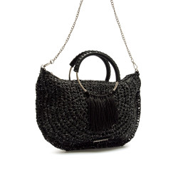 Bolso de mano de la marca Mariamare, modelo Tempo de color negro. Diseñado en rafia trenzada con hilo plateado brillante, su forma semicircular y estructura flexible le aportan un estilo veraniego con un toque elegante. Destaca por su borlón decorativo en la parte frontal y sus asas metálicas redondas, forradas en polipiel negra con detalle de costuras decorativas. Incluye cadena metálica plateada desmontable para llevarlo también al hombro o cruzado. Su interior está forrado y cuenta con cierre de cremallera. Un bolso versátil y sofisticado, ideal tanto para el día como para la noche.