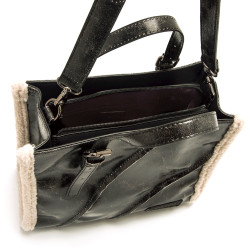 Bolso de color negro para mujer de la marca mtng modelo Waldy, con un diseño shopper de efecto desgastado y detalles de borreguillo beige en los bordes. Las asas cortas combinadas con la bandolera extraíble ofrecen varias opciones para llevarlo, mientras que el cierre superior con cremallera y los acabados curvados en relieve en la parte frontal aportan un toque distintivo. Ideal para quienes buscan un estilo urbano con un aire invernal, sin renunciar a la practicidad del formato rectangular y amplio.