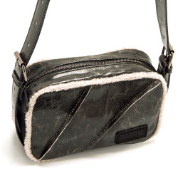 Bandolera de color negro texturizado para mujer de la marca mtng, modelo Wolly. Este diseño compacto y funcional destaca por sus costuras decorativas en el frontal y los detalles de borreguito de color natural que rematan todo el borde, aportando un toque invernal muy actual. Incluye asa ajustable para mayor comodidad y cierre de cremallera en la parte superior. Ideal para llevar lo imprescindible en tu día a día con estilo.