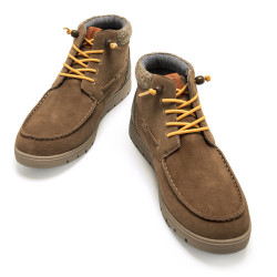 Zapato náutico abotinado de color taupe para hombre, modelo Denver de MTNG. Fabricado con piel que proviene de fabricantes aprobados por el protocolo «Leather Working Group», donde evalúan el cumplimiento ambiental y el desempeño, promoviendo prácticas comerciales ambientales sostenibles dentro de la industria del cuero. Presenta detalles en contraste de color gris en el talón y cuello acolchado con tejido tipo tweed multicolor, que aporta calidez y un toque distintivo. Incluye cordones amarillos con cierre ajustable mediante tope. Incorporan una plantilla extraíble con tecnología Starfit y diseño termoconformado, que se adapta perfectamente al contorno del pie para ofrecer un soporte óptimo. Gracias a la espuma Comfort Foam, garantizan una amortiguación excepcional y comodidad durante todo el día.