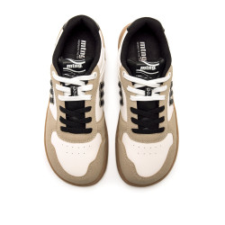 Zapatillas Free Miami de color blanco y crudo para hombre de la marca Mtng con inspiración retro. El contraste entre los cordones negros, el logo lateral y la suela en tono caramelo le da un aire actual a una silueta clásica. Diseñadas y desarrolladas especialmente en colaboración con el Dr. Juanjo López, traumatólogo deportivo, para respetar el desarrollo natural del pie. Se trata de un calzado minimalista que gracias a su puntera ancha, suela totalmente plana (cero drop) y flexibilidad, mejora la anatomía del pie y favorece una mejor posición del mismo. Se vende con una plantilla de transición para hacer el cambio de calzado convencional a minimalista de manera progresiva. Con certificado VEGANO sellado por INESCOP, el cual garantiza que la naturaleza química principal del material no se corresponde con fibras de origen animal.