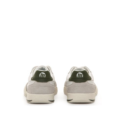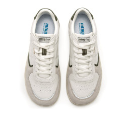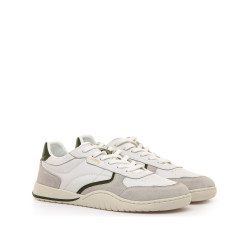 Zapatillas barefoot de piel de color blanco roto con detalles en verde kaki para hombre, modelo Free Orbit de la marca MTNG. Presentan una combinación de paneles lisos y piezas grises en contraste. El diseño mantiene una estética deportiva con líneas curvas y costuras visibles, pensadas para el uso diario. Diseñadas y desarrolladas especialmente en colaboración con el Dr. Juanjo López, traumatólogo deportivo, para respetar el desarrollo natural del pie. Se trata de un calzado minimalista que gracias a su puntera ancha, suela totalmente plana y flexibilidad, mejora la anatomía del pie y favorece una mejor posición del mismo. Se vende con una plantilla de transición para hacer el cambio de calzado convencional a minimalista de manera progresiva.