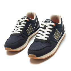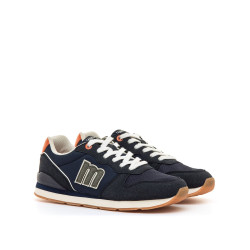 Zapatilla casual de color azul marino para hombre de la marca Mtng, modelo Joggo Classic. Diseñada con una silueta retro inspirada en el running clásico, combina diferentes texturas y detalles en contraste, como el talón de color naranja y el logotipo lateral en relieve. Incorpora cordones blancos, una suela bicolor con base de goma y plantillas con tecnología Starfit, que mejoran la comodidad en cada paso. Ideal para un uso cómodo, este modelo destaca por su versatilidad y toque deportivo para completar looks relajados. Con certificado VEGANO sellado por INESCOP, el cual garantiza que la naturaleza química principal del material no se corresponde con fibras de origen animal.