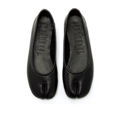Bailarina plana con puntera tipo tabi de la marca MTNG, modelo Tabatha de color negro para mujer. Este diseño incorpora una ligera separación frontal de los dedos, junto a una suela fina que aporta comodidad. Su acabado liso se completa con el logo metálico trasero, encajando fácilmente en looks urbanos o más formales. Con certificado VEGANO sellado por INESCOP, el cual garantiza que la naturaleza química principal del material no se corresponde con fibras de origen animal.