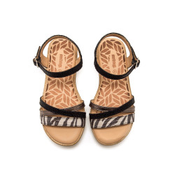 Sandalias de color negro para niña de Mtng, modelo Aire con plataforma tipo esparto. Este diseño combina tiras de acabado texturizado con una banda frontal de estampado animal de cebra y otra gris metalizada, aportando un toque actual y versátil. Incorpora cierre de hebilla ajustable al tobillo para una mejor sujeción y plantilla acolchada que favorece la comodidad en cada paso. La plataforma ligera con detalle trenzado refuerza su aire veraniego, ideal para combinar con vestidos, faldas o conjuntos informales en los días más cálidos.