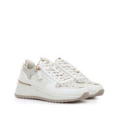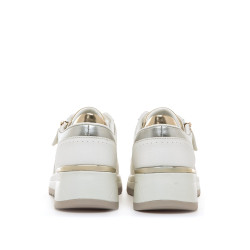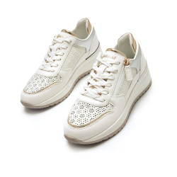 Zapatillas de color blanco para mujer de la marca Mariamare, modelo Salerno de estilo urbano con plataforma. Este diseño destaca por sus detalles perforados con formas florales en la puntera y los laterales, que aportan un toque decorativo sutil. La cremallera lateral con tirador a tono y los acabados metalizados en dorado y plata elevan el look del calzado. La suela con plataforma dentada y sus plantillas con tecnología Starfit, mejoran la comodidad en cada paso. Con certificado VEGANO sellado por INESCOP, el cual garantiza que la naturaleza química principal del material no se corresponde con fibras de origen animal.