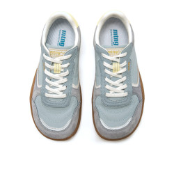 Zapatilla barefoot de color azul claro para mujer de la marca Mtng, modelo Free Orbit de estilo retro sport. Su combinación de texturas y detalles en contraste como el talón en amarillo pastel y la suela caramelo curvada le dan un toque desenfadado y actual. Diseñadas y desarrolladas especialmente en colaboración con el Dr. Juanjo López, traumatólogo deportivo, para respetar el desarrollo natural del pie. Se trata de un calzado minimalista que gracias a su puntera ancha, suela totalmente plana (cero drop) y flexibilidad, mejora la anatomía del pie y favorece una mejor posición del mismo. Se vende con una plantilla de transición para hacer el cambio de calzado convencional a minimalista de manera progresiva.