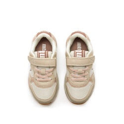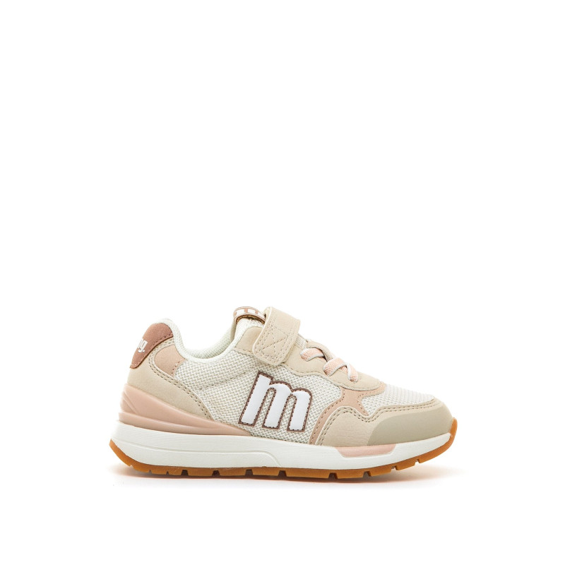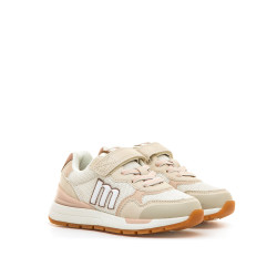 Zapatillas deportivas de color beige con detalles en rosa claro para niña, modelo Compact de la marca mtng. Su diseño combina paneles de malla y piezas sintéticas en tonos suaves. Incorpora una suela Extralight que aporta ligereza, y plantilla Starfit que mejoran la comodidad en cada pisada. El cierre adhesivo con cordones elásticos facilita el ajuste y favorece la autonomía. Con certificado VEGANO sellado por INESCOP, el cual garantiza que la naturaleza química principal del material no se corresponde con fibras de origen animal.
