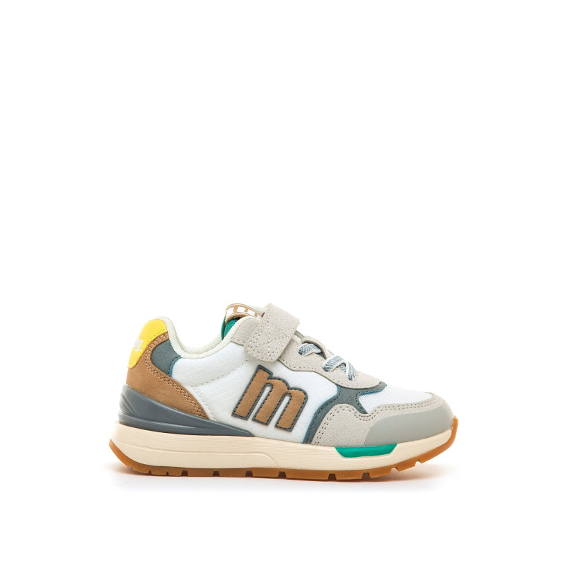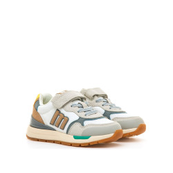 Zapatillas de color blanco para niño, modelo Compact de mtng con estilo retro deportivo. Combinan diferentes tonos en la parte superior como gris, camel y toques de verde y amarillo, que aportan un diseño actual y fácil de combinar. El cierre adhesivo y cordones elásticos facilita el ajuste y la autonomía del niño. Incorporan suela con tecnología Extralight que proporciona mayor ligereza y flexibilidad, y plantilla con tecnología Starfit que ofrece una pisada más cómoda durante todo el día. Ideales para acompañar el ritmo de los peques con comodidad y estilo. Con certificado VEGANO sellado por INESCOP, el cual garantiza que la naturaleza química principal del material no se corresponde con fibras de origen animal.