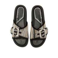 Sandalia plana de color negro para mujer, modelo Fraine de Mariamare con pala ancha de tejido combinado en tonos neutros. Incorpora una gran hebilla decorativa con detalle de strass que aporta un toque brillante, además de ribetes desflecados que refuerzan su diseño. Su planta acolchada y su suela dentada de color negro favorecen una pisada cómoda y estable. Ideal para looks urbanos de verano que buscan comodidad sin renunciar a la personalidad. Con certificado VEGANO sellado por INESCOP, el cual garantiza que la naturaleza química principal del material no se corresponde con fibras de origen animal.